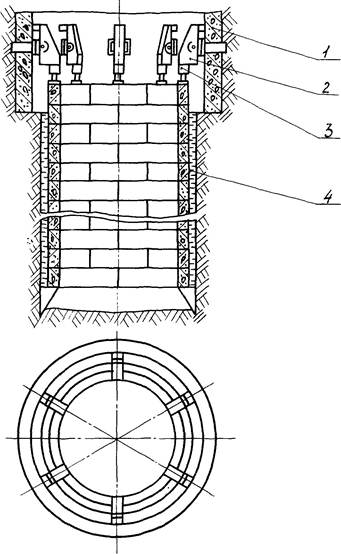 1 - опорная конструкция; 2 - угловой упор; 3 - домкрат; 4 - сборные стены колодца