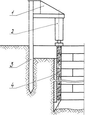 1 - стойка; 2 - консоль; 3 - домкрат; 4 - секция стен колодца