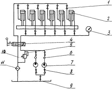1 - вентиль; 2 - домкрат; 3 - манометр с демпфером; 4 - золотник;