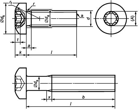 ___________________ а Размеры, заключенные в скобки, применять не рекомендуется. b P - шаг резьбы. с Винты с номинальными длинами выше пунктирной ступенчатой линии имеют резьбу до головки (b = l - а). См. ИСО 888. Примечание - Винты со стандартными длинами находятся между поперечными ступенчатыми линиями. |