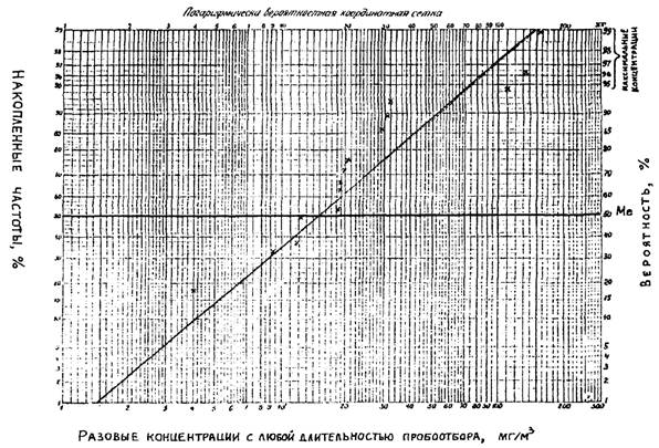• На логарифмически вероятностную сетку (рисунок 1 данного приложения) наносят значения концентраций (по оси абцисс) и соответствующие им накопленные частоты (по оси ординат) в процентах. Через нанесенные точки строится прямая.