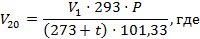 Приведение объема воздуха к стандартным условиям при температуре 293 К (20 °С) и атмосферном давлении 101,33 кПа (760 мм рт. ст.) проводят по формуле: