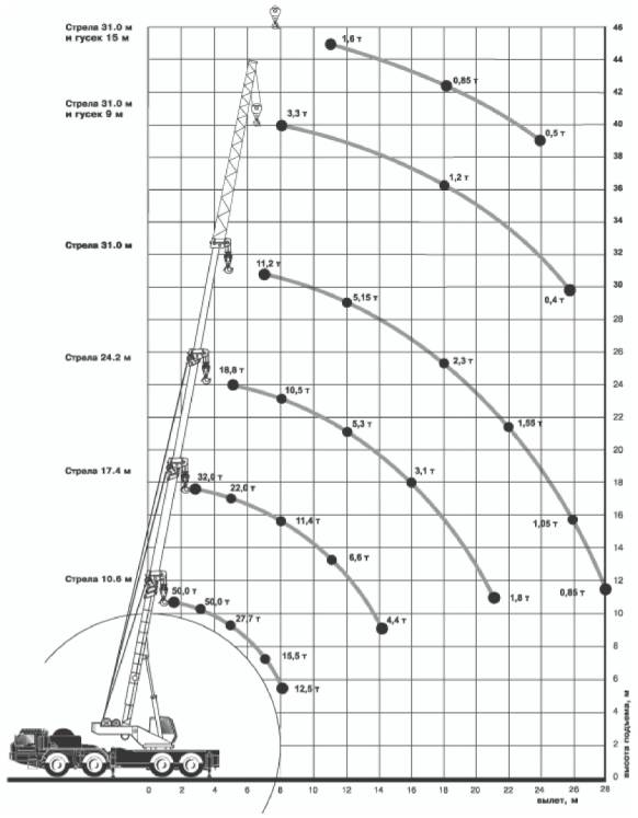 Автокран КС-6973Б Ивановец имеет следующие грузоподъемные характеристики: