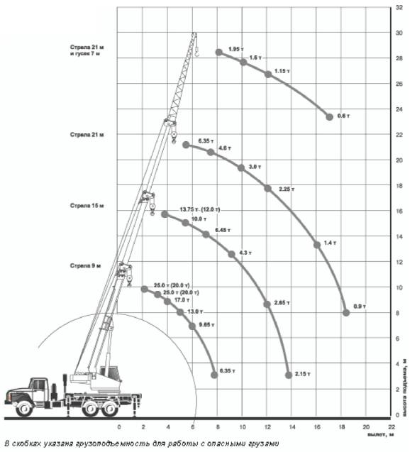 Автокран КС-45717-1 Ивановец имеет следующие грузовысотные характеристики: