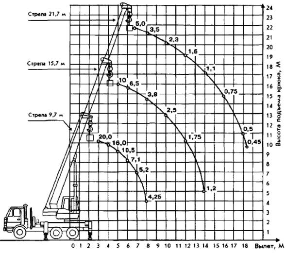 Автокран КС-45719-1 Галичанин имеет следующие грузовысотные характеристики: