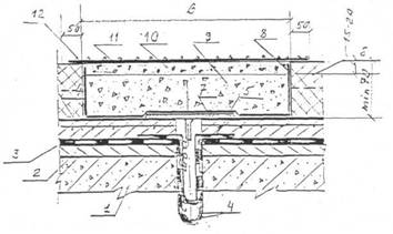 1 - плита проезжей части; 2 - выравнивающий слой; 3 - гидроизоляция; 4 - компенсатор из 2 слоев гидроизоляционного материала; 5 - защитный армированный бетонный слой; 6 - двухслойное асфальтобетонное покрытие; 7 - металлическая пластина; 8 - обмазка горячей резино-битумной мастикой; 9 - щебеночно-мастичное заполнение, полученное смешением на месте; 10 - щебеночно-мастичное заполнение, полученное смешением в мешалке; 11 - резино-битумная мастика; 12 - мелкий щебень.
