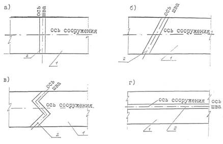 а) перпендикулярно к оси сооружения; б) под углом к оси сооружения; в) зигзагообразное расположение; г) продольный шов. 1 - пролетное строение; 2 - конструкция «Шов Торма-Мост».