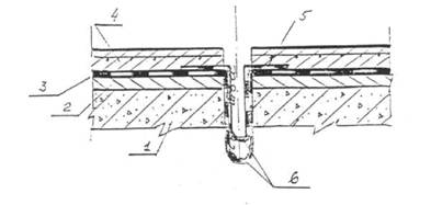 1 - несущая конструкция пролетного строения; 2 - выравнивающий слой; 3 - гидроизоляция; 4 - защитный слой; 5 - дополнительный слой лотка компенсатора; 6 - компенсатор.