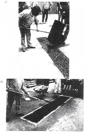 а) загрузка штрабы щебнем, обработанным мастикой; б) завершающий этап заполнения штрабы.