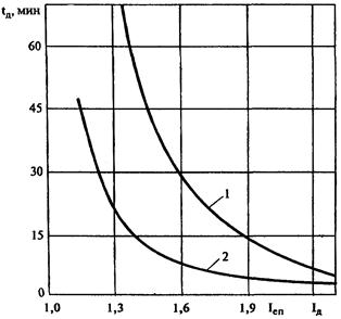 3.3. При Jн > t'x пропуск поезда повышенного веса возможен, если полное время t'x его хода по межподстанционной зоне не превышает допустимого значения tд, определяемого в зависимости от отношения среднего тока поезда Iопм к допустимому Iд контактной сети (рис. 2).