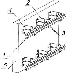 1 - профиль шляпный 23 (60); 2 - кронштейн составной; 3 - заклепки (самонарезающие винты); 4 - анкер; 5 - стена.
