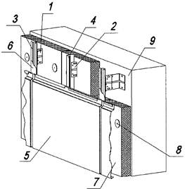 1 - кронштейн составной; 2 - кронштейн опорный; 3 - шляпный профиль 60П; 4 - профиль L - образный; 5 - фиброцементная плита; 6 - резиновая пластина EPDM; 7 - упор дюбельный для крепления утеплителя; 8 - утеплитель; 9 - стена.
