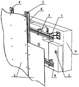 1 - кронштейн составной; 2 - кронштейн опорный; 3 - профиль шляпный 23; 4 - профиль L-образный; 5 - кассета фасадная; 6 - фоновая пластина; 7 - утеплитель; 8 - упор дюбельный для крепления утеплителя; 9 - стена.