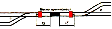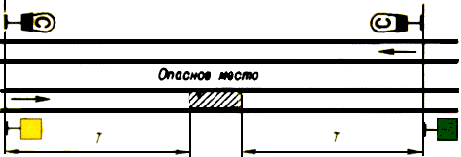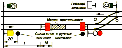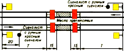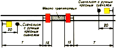 Если на двухпутном или многопутном участке по смежному пути будет следовать встречный поезд, то красный сигнал, ограждающий съемную ремонтную вышку, путевой вагончик или другую съемную подвижную единицу со стороны следования встречного поезда, до прохода поезда снимается.