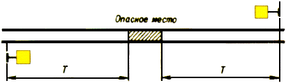 2.11. На участках с автоблокировкой условно-разрешающий сигнал проходного светофора, расположенного на затяжном подъеме, подаваемый щитом с отражательным знаком прозрачно-белого цвета в виде буквы "Т" (рис. 2.11), разрешает грузовому поезду проследование светофора с красным огнем со скоростью не более 15 км/ч с особой бдительностью и готовностью немедленно остановиться, если встретится препятствие для дальнейшего движения.
