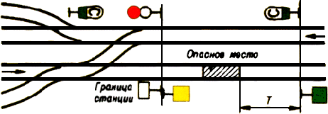 при приеме поезда по неправильному пути (при отсутствии входного светофора по этому пути). Этот сигнал должен подаваться и при дальнейшем следовании по горловине станции;