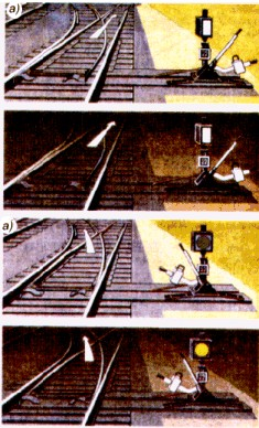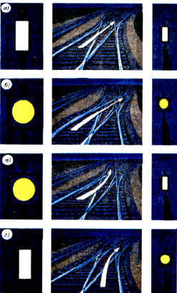 один желтый огонь - "Разрешается поезду отправиться со станции и следовать с готовностью остановиться; следующий светофор закрыт" (рис. 2.7, б);