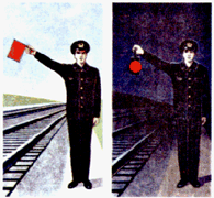 днем - прямоугольный щит, окрашенный с обеих сторон в красный цвет, или развернутый красный флаг на шесте;