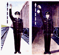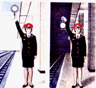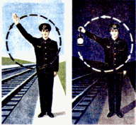 Дежурный по станции или по его указанию сигналист, дежурный стрелочного поста, составитель; отвечает машинист ведущего локомотива; повторяет сигнал машинист второго локомотива при двойной тяге. Если поезд отправляется с пути, имеющего выходной светофор, этот сигнал подает машинист ведущего локомотива, после открытия выходного светофора; повторяет сигнал машинист второго локомотива при двойной тяге. |