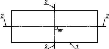 3.1.2.1 Измерения проводят на образцах, отобранных из элементов штучных форм. Толщину отобранного образца измеряют в четырех взаимно перпендикулярных направлениях при помощи штангенциркуля с точностью до 0,5 мм (см. рисунок 1).