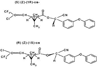 Название действующего вещества по ИСО: лямбда-Цигалотрин. Название по ИЮПАК: (S,R)-α-циано-3-феноксибензил (1R,1S)-цис-3-(2-хлор-3,3,3-трифторпропенил)-2,2 диметилциклопропанкарбоксилат (1⋅1).