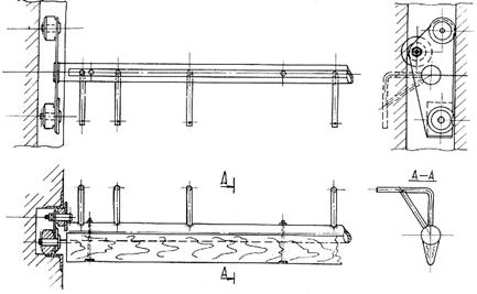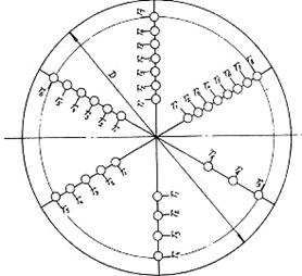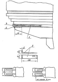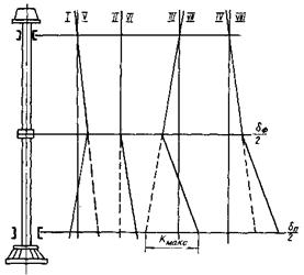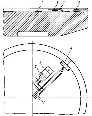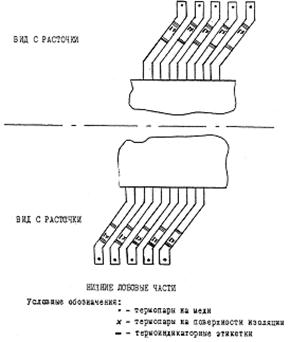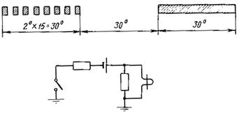 В ряде случаев при испытаниях требуется фиксировать угол поворота вала (ротора) гидроагрегата в начальной стадии пуска. Для этого на хорошо зачищенную поверхность вала наклеиваются метки из изоляционного материала (лакоткань, хлорвиниловая лента, калька и т.д.), как показано на рис. 8. При каждом пуске перед первой меткой на минимально возможном расстоянии от нее ставится контактная щетка. При трогании ротора происходит размыкание контакта и затем через каждые 2° поворота вала происходит замыкание и размыкание контакта, что фиксируется на ленте осциллографа одновременно с другими измеряемыми величинами (осевым усилием, толщиной масляной пленки и др.)