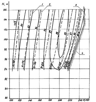Ш.6.1 Для повышения эффективности использования сжатого воздуха при переводе гидроагрегата в режим СК отжатие воды в камере рабочего колеса турбины необходимо производить до оптимального уровня, который не всегда удается определить при проектировании. Поэтому этот уовень уточняют при проведении специальных испытаний. Для этого в первую очередь следует определить верхний предел уровня отжатия воды. С этой целью гидроагрегат переводят в режим СК на ручном управлении. Воду отжимают на 1 - 2 м ниже рабочего колеса. Затем воздух из камеры постепенно выпускают через специальный воздухопровод или клапан срыва вакуума, что приводит к подъему отжатого уровня воды в камере. При этом регистрируют мощность, потребляемая агрегатом из сети, давление в камере и отметка нижнего бьефа. При достижении уровня рабочего колеса происходит захват его лопастной системой с одновременным увеличением потребляемой мощности и гидроагрегат переходит в насосный режим. Момент начала изменения мощности, потребляемой гидроагрегатом из сети, и является критерием достижения уровня рабочего колеса гидротурбины. Таким образом, уровень захвата (УЗ) воды рабочим колесом при давлении в камере Рв и уровне нижнего бьефа УНБ составит