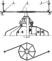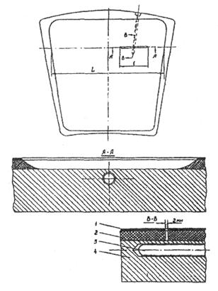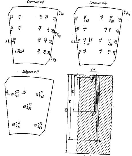 При испытаниях устанавливается четыре датчика: три на одном радиусе у наружного края, в середине и у внутреннего края диска и один - на противоположном радиусе - у наружного края диска.