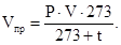 Ш.5.1 При переводе гидроагрегата в режим СК сжатый воздух из пневмосистемы в основном расходуется на заполнение камеры рабочего колеса и потери в нижний бьеф. Для определения расхода воздуха используется формула приведенных объемов, т.е. объем воздуха, содержащийся в емкости V (м3), при давлении Р (МПа) и температуре t (°С) приводится к объему при атмосферном давлении и температуре 0 °С: