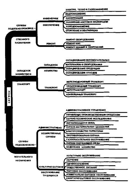1.1. На предприятиях функционируют многочисленные службы различного назначения, связанные с обслуживанием производства, хранением и транспортированием материалов и продуктов, административно-хозяйственной деятельностью предприятия и обслуживанием трудящихся. На промышленной площадке предусматривается, как правило, несколько десятков служб, составляющих единое обслуживающее хозяйство (рис. 1).