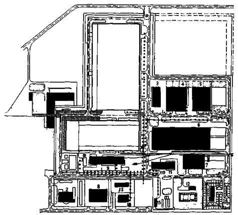 Подсобные, складские и вспомогательные здания и сооружения и образуемые ими зоны и панели застройки совместно с сетью дорог и коммуникаций могут составлять структурную основу композиции предприятия. Объекты обслуживающих систем, изменяясь во времени с меньшей интенсивностью, чем основное производство, делают композицию развивающегося предприятия в определенной мере законченной.