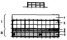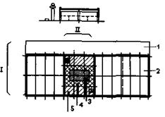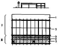 а, б - одноэтажные здания с протяженным и концентрированным размещением блока «обеспечения»; в - многоэтажные здания; I - технологические блоки; II - блоки «обеспечения»; 1 - открытая площадка для оборудования или хозяйственный двор; 2 - производственные помещения; 3 - «темная» зона; 4 - транзитный коридор; 5- «светлая» зона