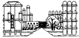 обогащение силуэта зданий путем вертикального блокирования отдельных функциональных блоков и инженерных сооружений. В тех случаях, когда объекты предзаводской зоны размещаются на фоне крупных протяженных зданий производственного назначения, блокирование их по вертикали позволяет создавать компактные разновысотные группы, способствующие наряду с обогащением композиции лицевой застройки на основе контраста форм максимальному раскрытию для обозрения производственных объектов. В подсобной зоне вертикальное блокирование зданий с инженерными сооружениями, размещаемыми обычно отдельно стоящими (градирни, емкости и т.д.), способствует повышению выразительности объемов в целом, благодаря контрасту форм и обогащению силуэта;