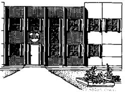 В зданиях обслуживающего назначения целесообразно акцентировать блок «обеспечения», где размещены более мелкие и «масштабные» помещения, выявлять на фасадах соразмерные человеку детали и элементы (входы, лестницы, оконные проемы и др.) (рис. 24).