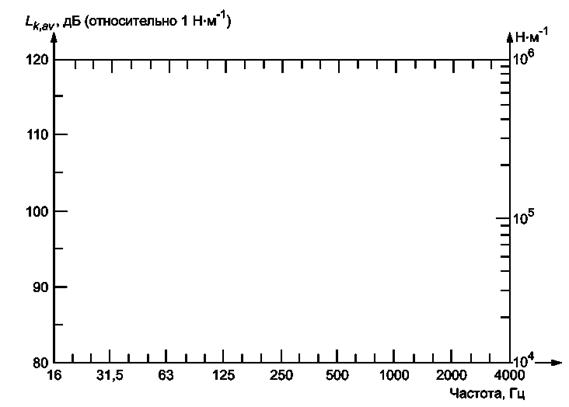 Примечание - Пример представления данных в графическом формате показан на рисунке 14. В дополнение к шкале в децибелах (вертикальная шкала слева) справа приведена вертикальная логарифмическая шкала в ньютонах на метр.