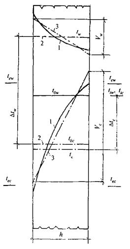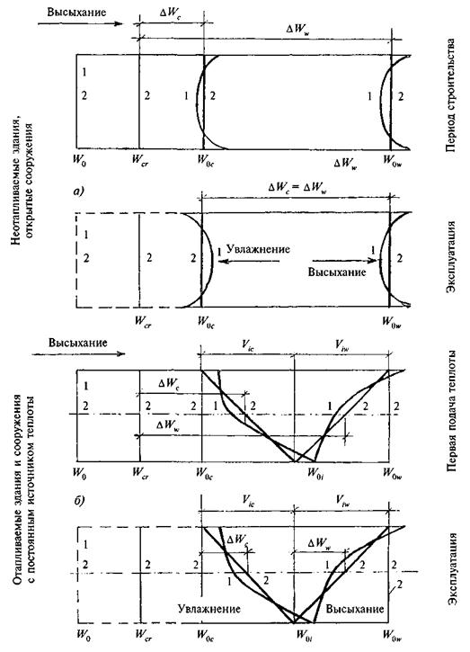 1 - действительное распределение влажности бетона; 2 - расчетное распределение влажности бетона; W0 - начальная влажность бетона W0 > Wcr; Wcr - критическая влажность бетона, с уменьшением которой развиваются деформации усадки; W0c, W0w - равновесная влажность сечения или грани бетона в холодное (январь) и теплое (июль) время года; W0i - равновесная влажность грани бетона, находящегося в закрытом помещении; ΔWc, Vic и ΔWw, Viw - изменение средней равновесной влажности и перепада влажности по сечению соответственно в холодное и теплое время года