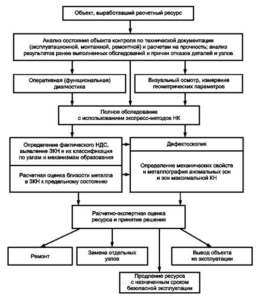 5.2.5 Основные этапы процесса определения остаточного ресурса потенциально опасных объектов, подконтрольных органам Ростехнадзора, показаны на структурной схеме в приложении А. Структурная схема предусматривает полное обследование ОК с использованием экспресс-методов технической диагностики.