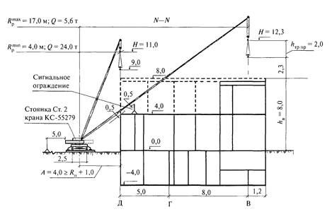 Схема вертикальной привязки монтажного крана к строящемуся зданию показана в сечении N - N на стоянке Ст. 2 (рисунок 2). Расстояние от оси крана до стены здания А = 4 м составляет не меньше наибольшего радиуса поворотной части крана Rп и нормативного габарита приближения 1 м. Минимальные расстояния от стрелы до металлоконструкций здания и до сигнального ограждения при этом соответствуют нормативным - 0,5 м. Опасная зона от перемещения подвижных частей крана принята на расстоянии 5 м.