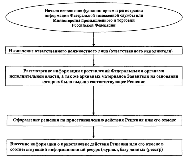 - оформление решения по приостановлению действия Решения или его отмене и информирование Министерства промышленности и торговли Российской Федерации, Федеральную таможенную службу о приостановлении действия Решения или его отмене, владельца Решения о приостановлении действия Решения или его отмене;