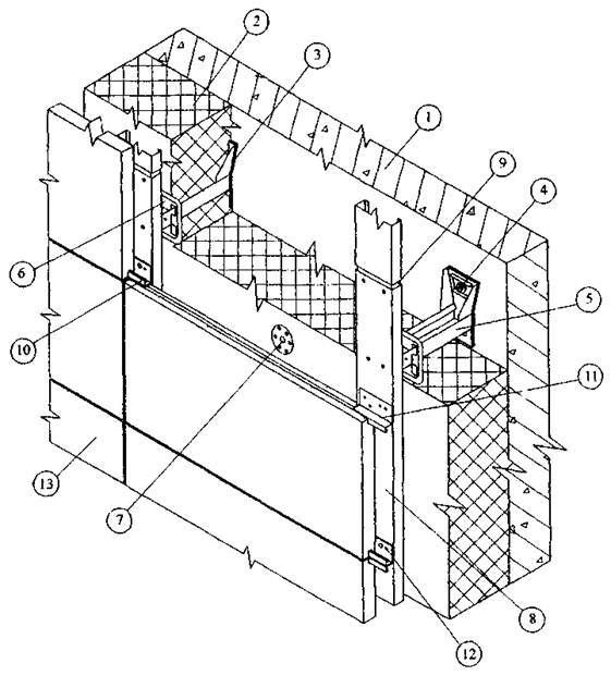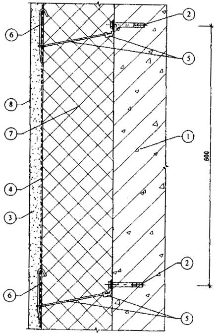 1. Основание. 2. Дюбель распорный. 3. Фасадный штукатурный слой. 4. Стальная оцинкованная штукатурная сетка. 5. Кронштейн. 6. Шпилька. 7. Минераловатный утеплитель. 8. Антивандальная капсульная краска.