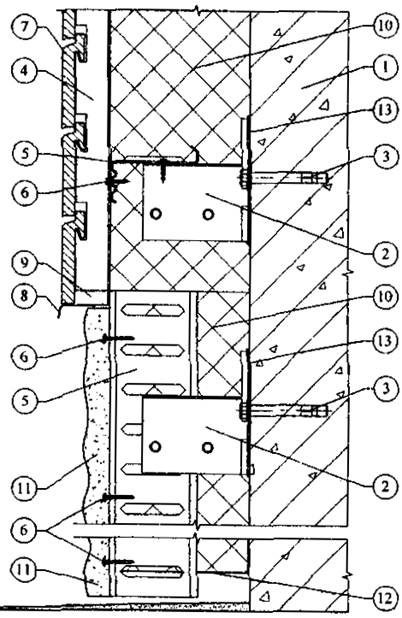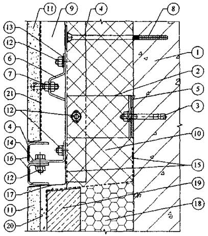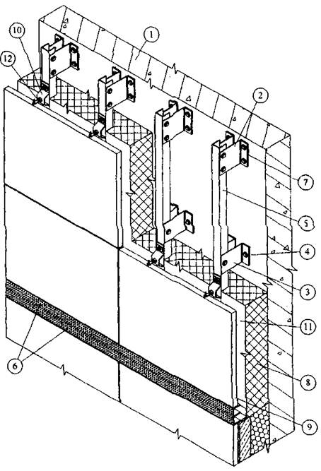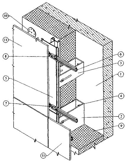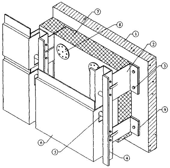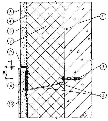 1. Основание. 2. Дюбель распорный. 3. Фасадный штукатурный слой. 4. Стальная оцинкованная штукатурная сетка. 5. Кронштейн. 6. Шпилька. 7. Минераловатный утеплитель. 8 Антивандальная капсульная краска. 9 Отверждающаяся мастика. 10. Облицовочная плитка.