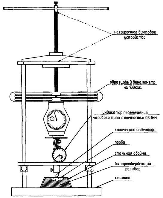 - острие конического индентора подводится к растворному участку поверхности пробы, где нет крупного заполнителя, и с помощью винта на индентор дается начальная нагрузка в 10 - 30 кгс;