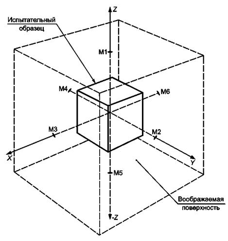 Рисунок А.2 - Типовое расположение микрофонов контрольных точек (1 - 6) на воображаемой поверхности вокруг образца