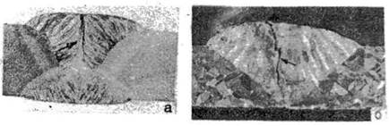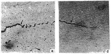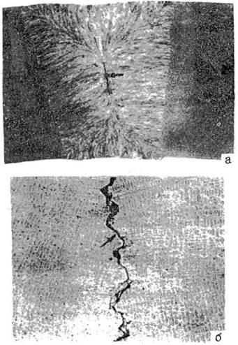 Горячие трещины образуются в сварных соединениях после кристаллизации. Различают трещины, залегающие в плоскости слабины и межкристаллитные. Поверхность этих трещин всегда покрыта окисной пленкой. Горячие трещины наиболее часто поражают металл шва и реже околошовную зону |