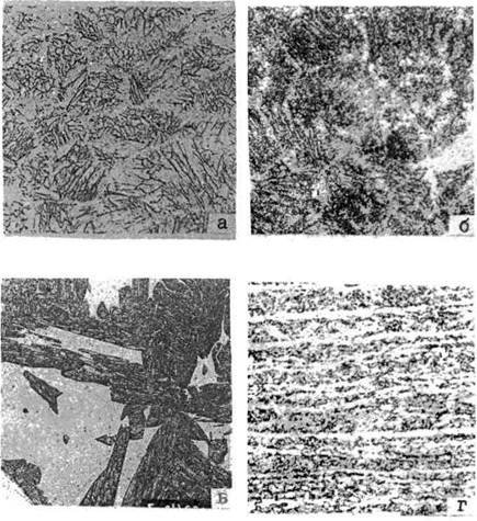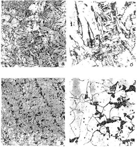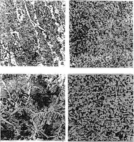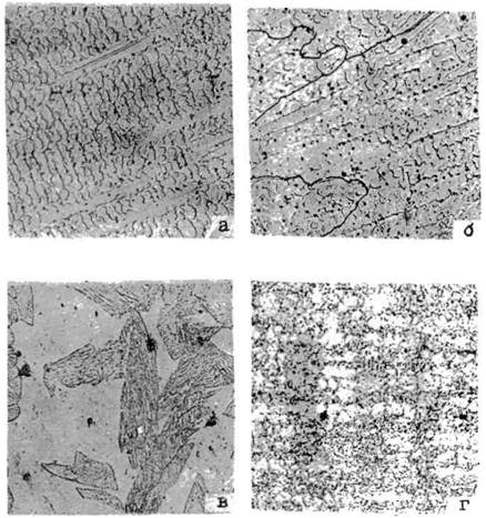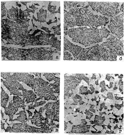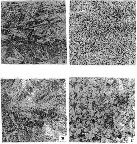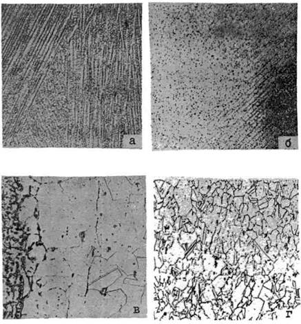 а - шов, литая ячеисто-дендритная; б - шов, кислородная эвтектика (недостаточная защита зоны сварки); в - околошовная зона (участок перегрева), α-фаза; г - основной металл; α-фаза, травление в реактиве № 9 (см. табл. 2), 200×