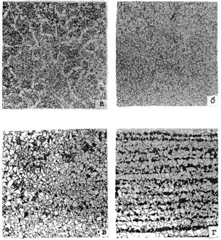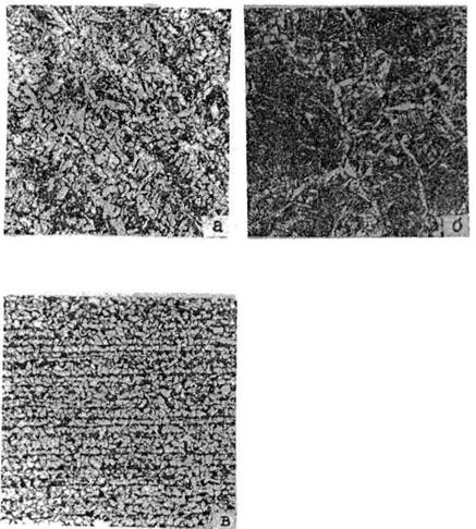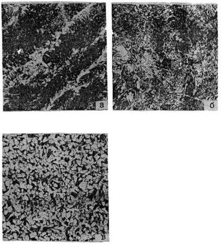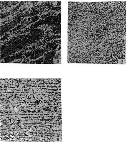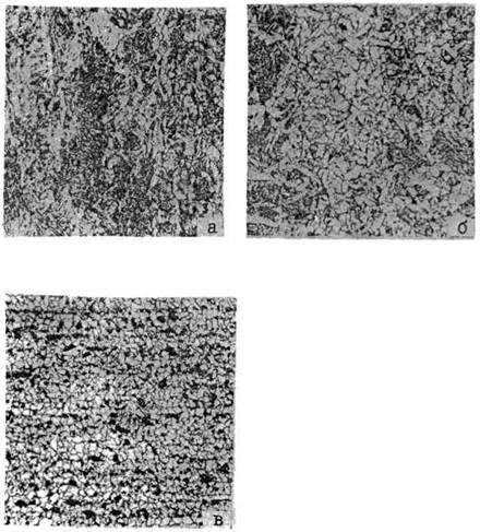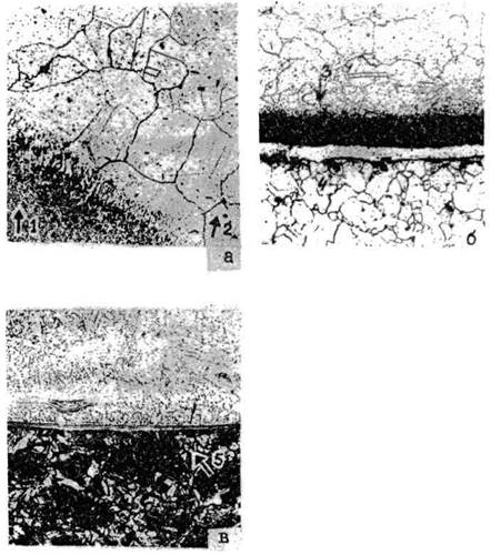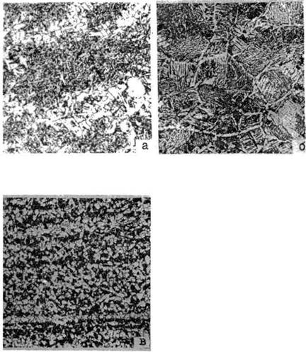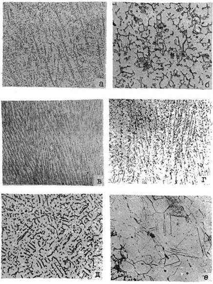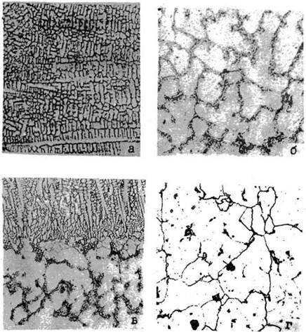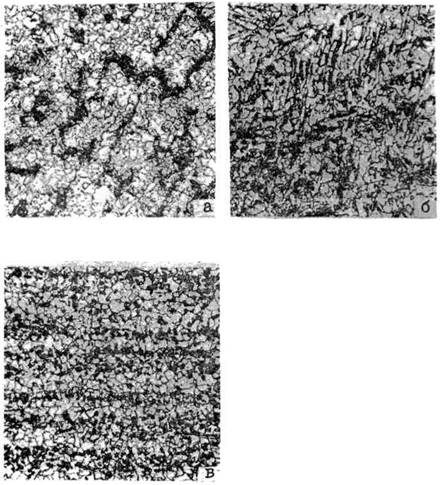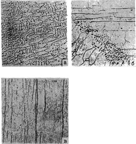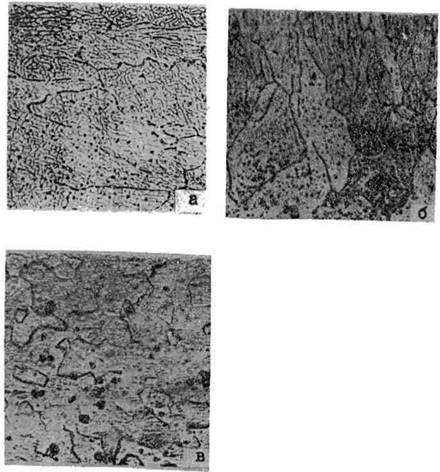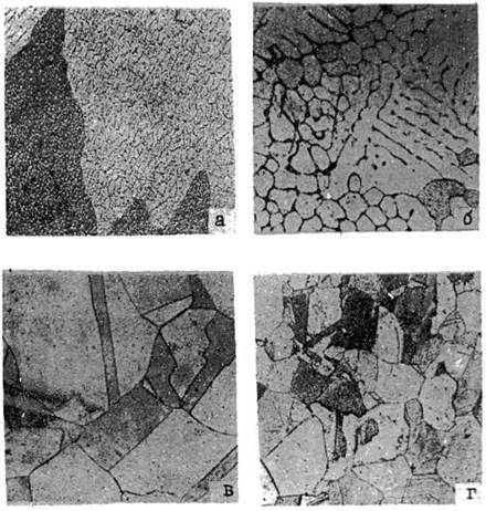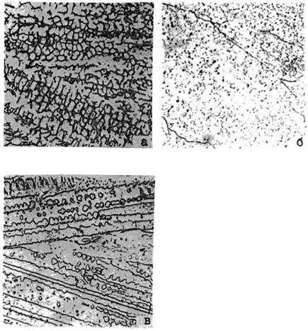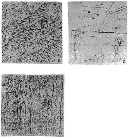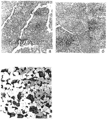 а - шов, проволока А85Т, ячеистая литая; б - околошовная зона (участок перегрева); в - основной металл, травление в реактиве № 11 (см. табл. 2), 200×