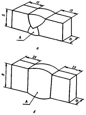 а - выполненного ручной, полуавтоматической или автоматической дуговой сваркой; б - выполненного электрошлаковой сваркой; А - исследуемая поверхность микрошлифа, S - толщина стенки изделия