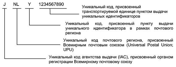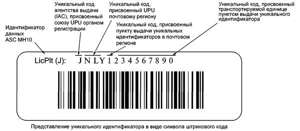 В соответствии с правилами Всемирного почтового союза (UPU) уникальный идентификатор должен содержать не более 35 алфавитно-цифровых знаков, где первый знак «J» является кодом агентства выдачи, присвоенным UPU органом регистрации. Следующие знаки присваивает UPU для учета и идентификации почтовых регионов. В соответствующих стандартах Всемирного почтового союза (UPU) установлены несколько различных структур. Одна из них использует двухзначные коды стран в соответствии с ИСО 3166 для учета почтовых регионов национальных почтовых органов каждой страны. Этот «идентификатор почтового органа» сопровождается полем свободного формата, в котором каждый почтовый орган может устанавливать собственную структуру в рамках настоящего стандарта (рисунок В.2).
