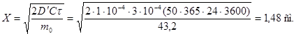 Пример 1 - Рассчитывают глубину карбонизации бетона X1, имеющего эффективный коэффициент диффузии углекислого газа 1 · 10-4 см2/с и реакционную емкость 43,2 см3/см3 за 50 лет при концентрации углекислого газа в воздухе 0,03 % (относительная величина 3 · 10-4):