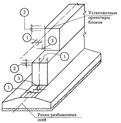 1. Отклонение от совмещения установочных ориентиров фундаментных блоков с рисками разбивочных осей 12 мм.